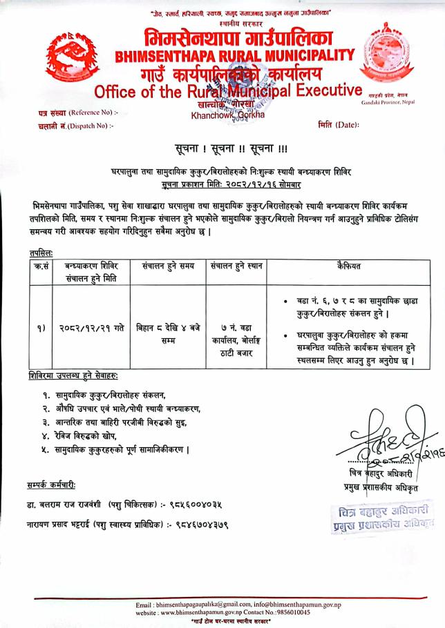 पशु स्वास्थ्य घुम्ती शिबिर तथा गाउँ टोल घर-घरमा पशु प्राबिधिक सेवा संचालनहुने सम्बन्धी सूचना ।