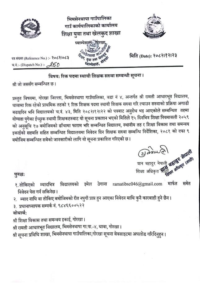 शिक्षक आवश्कता सम्बन्धमा।
